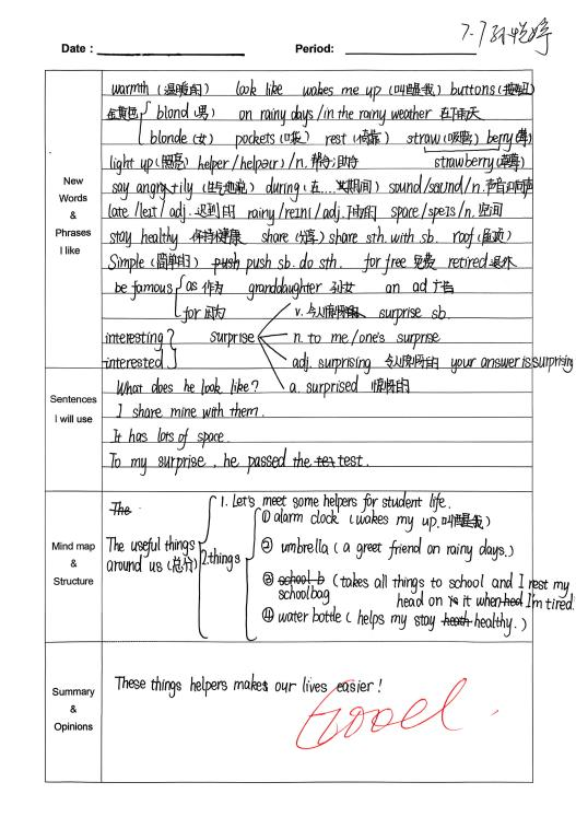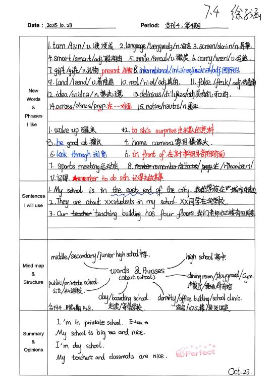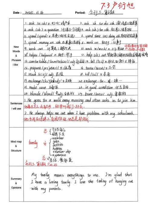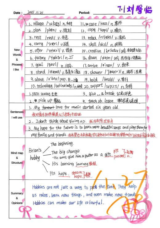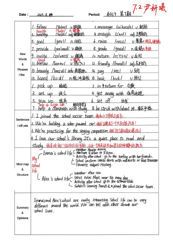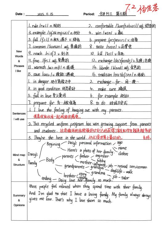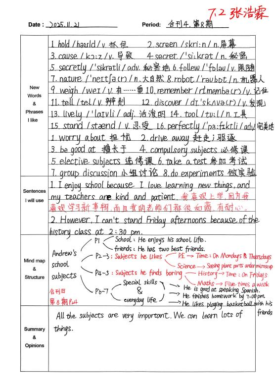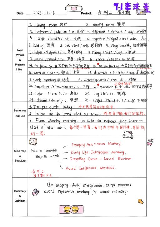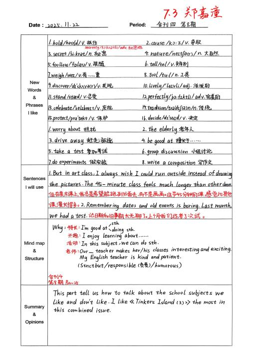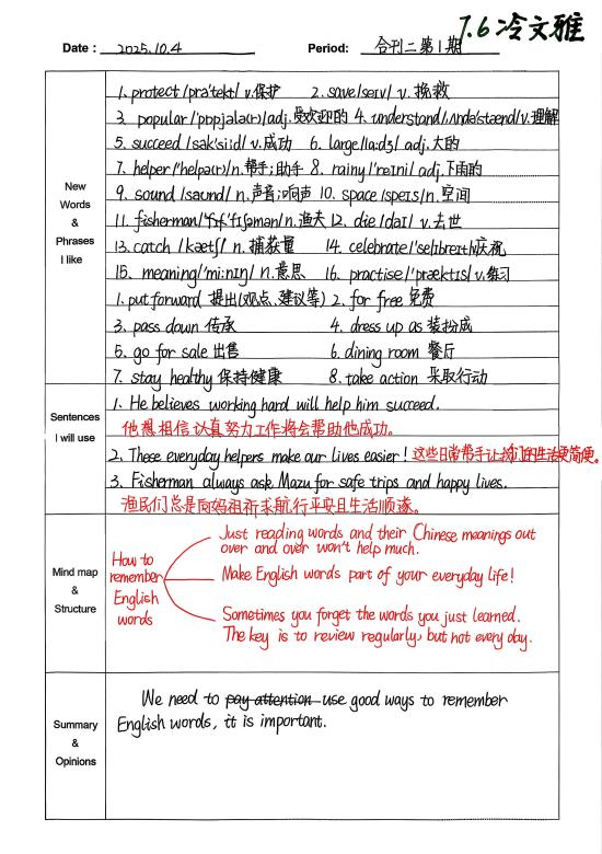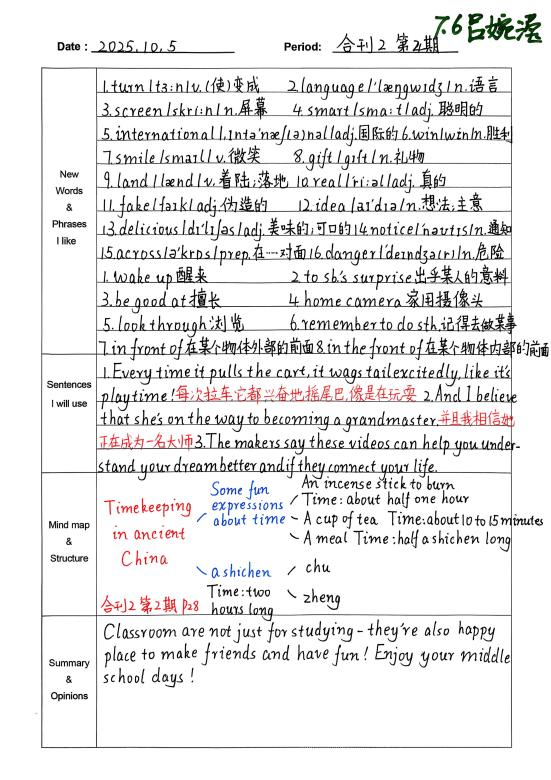 自从开始用积累本,我发现学英语的思路清晰多了。遇到warmth、strawberry这类生词,我会把意思、词性和例句记下来,慢慢积累后,读文章时就不用总查字典了。像“What does he look like?”这样的句型记熟后,写句子、说口语都更顺手。整理“The useful things around us”这篇课文时,我试着画思维导图,把内容分成闹钟、雨伞这些部分,课文的结构一下子就清楚了,背起来也轻松不少。积累本就像一个小本子,把零散的知识点都收起来,让我学英语时更有方向,也慢慢找到了成就感。(from孙悦婷)