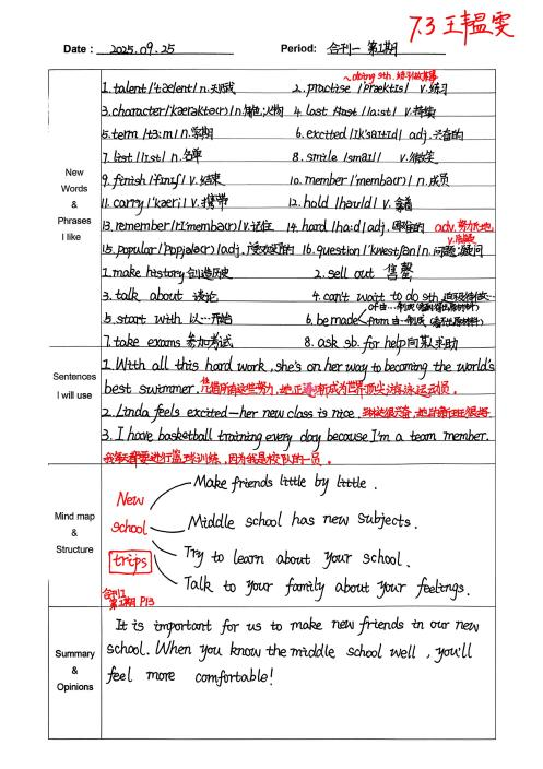翻开我的蓝色积累本里面标记着各种各样的词汇,这不只是普通的本于而是我的英语秘密武器。从前,阅读时遇到生词就像遇到路障第二次遇见也依旧不懂。但现在不同了,每次遇到生动的表达我都会把它誊抄在本子里。"serene" "comment", "discuss……这些原本陌生的单词在反复抄写和回味中渐渐成了我自己的词汇。这个周做英语阅读时我一眼就认出了我刚整理的新单词,那一刻的喜悦就如同遇见了一个老朋友。丰富了汇词汇,作文自然也更有色彩,写人物不只是写年龄"和高矮",更注重于写人物的性格特点:“outgoing, brave".句式也更加多样化看着满格的作文心中也充满了满足和成就感。积累本于我而言积累的不止是语言,更是成长路上的星光,每次一点点终将点亮自己的夜空。每个新的单词都是一个新坐标,带我去往更广阔的天地,编织属于我的想梦想蓝图。(from刘俏含)