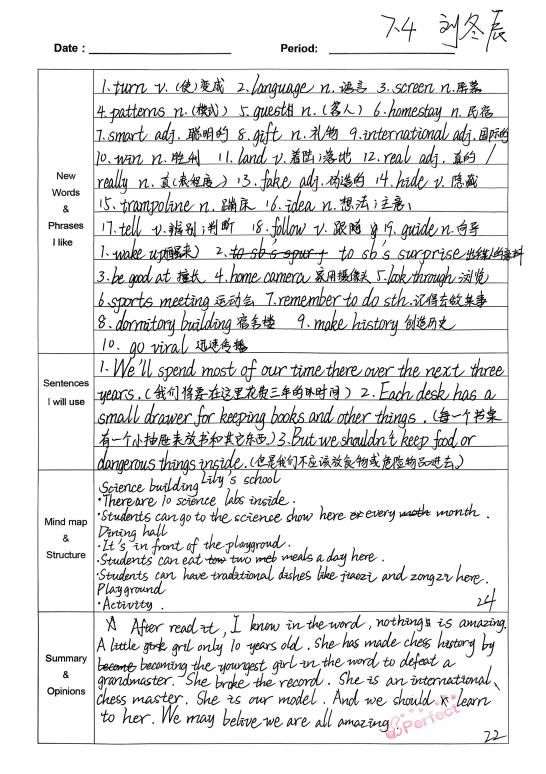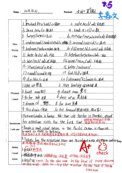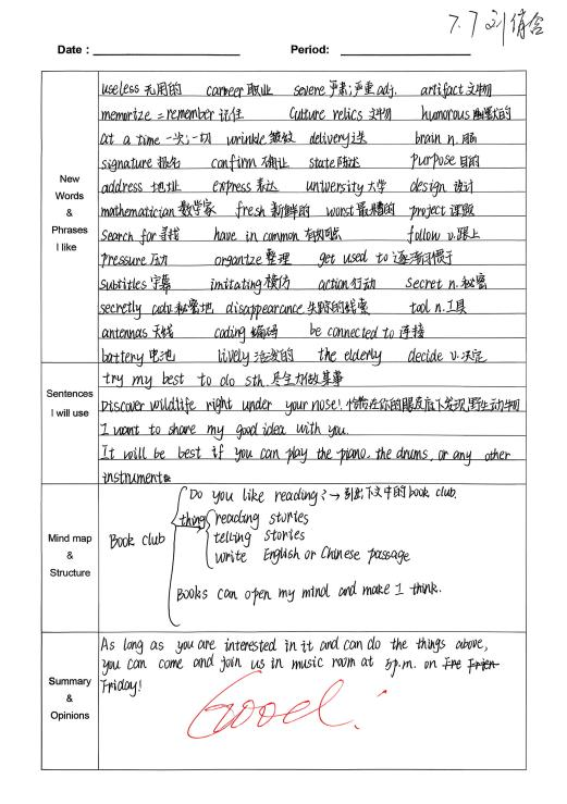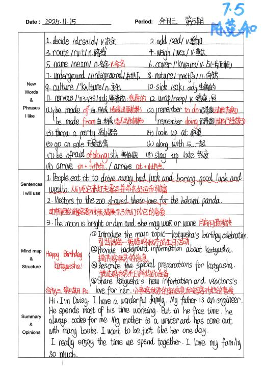通过半学期的积累,我已经积累了许多生词与词组。我会把老师强调的词汇与关键句整理到积累本上,重点内容用红笔标注。平时自主阅读时我也会进行复习和整理。试卷中的大部分题目来源于积累,积累更多词汇有助于理解阅读,今后我会积累更多词汇,在考试中灵活运用。(from陈菀和)