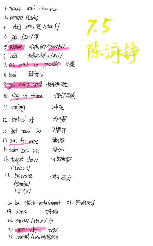 2. 积累本帮我汇总了那些不熟悉、易忘记、却又重要的单词。每周复习时,我会盖住中文意思,认真过一遍。如果还有记不住的,就用彩笔标出来,下次重点回顾——这样一眼就能看到薄弱环节,非常清晰。